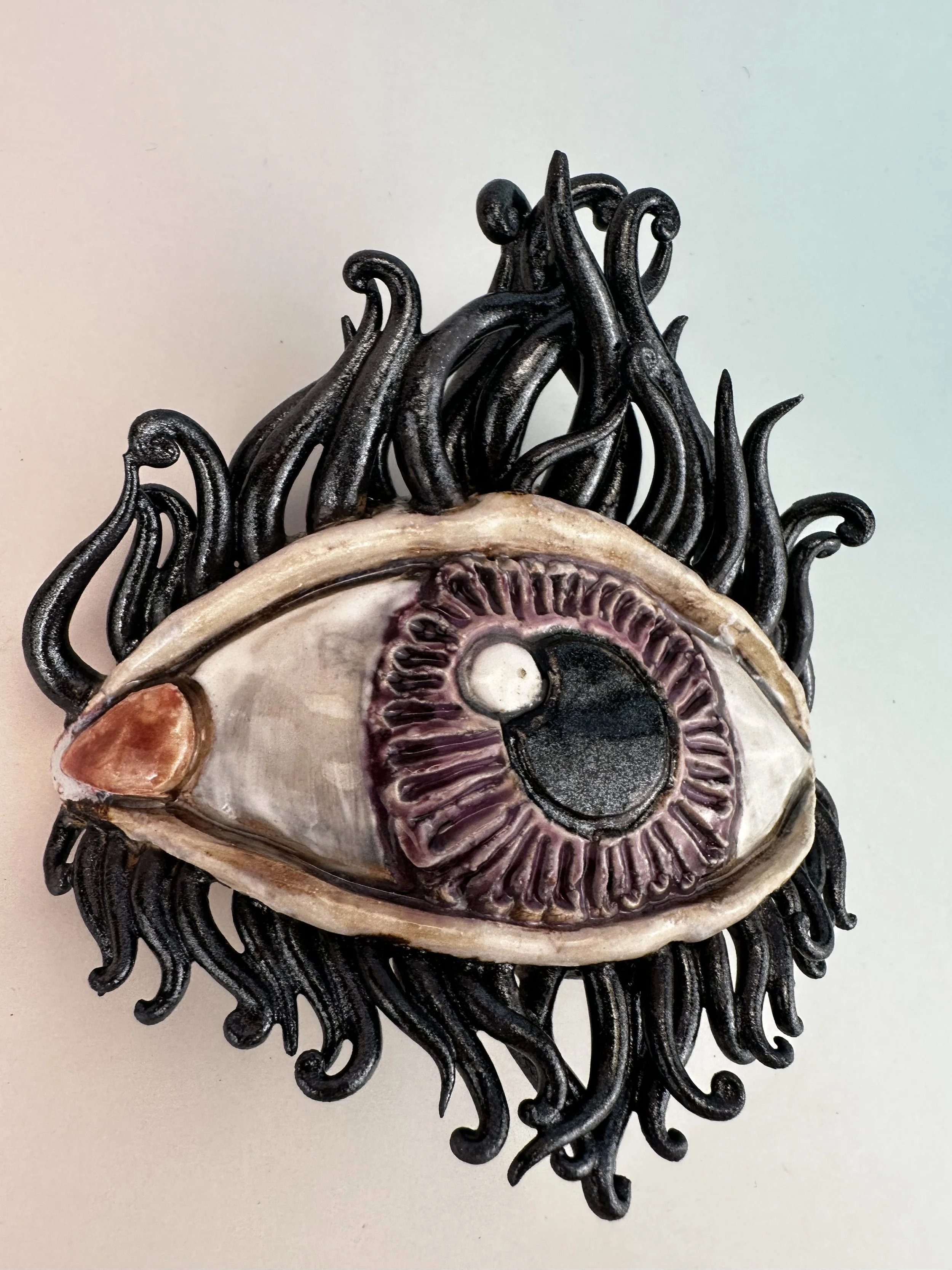 Once enough elements have accumulated, I combine fired ceramic pieces with raw clay, layering imagery and forms. The work is fired and glazed multiple times, resulting in a finished kaleidoscope of imagery and color. The final sculpture functions as a three-dimensional ceramic collage, where subtle visual metaphors of transformation, fragility, and resilience coexist.